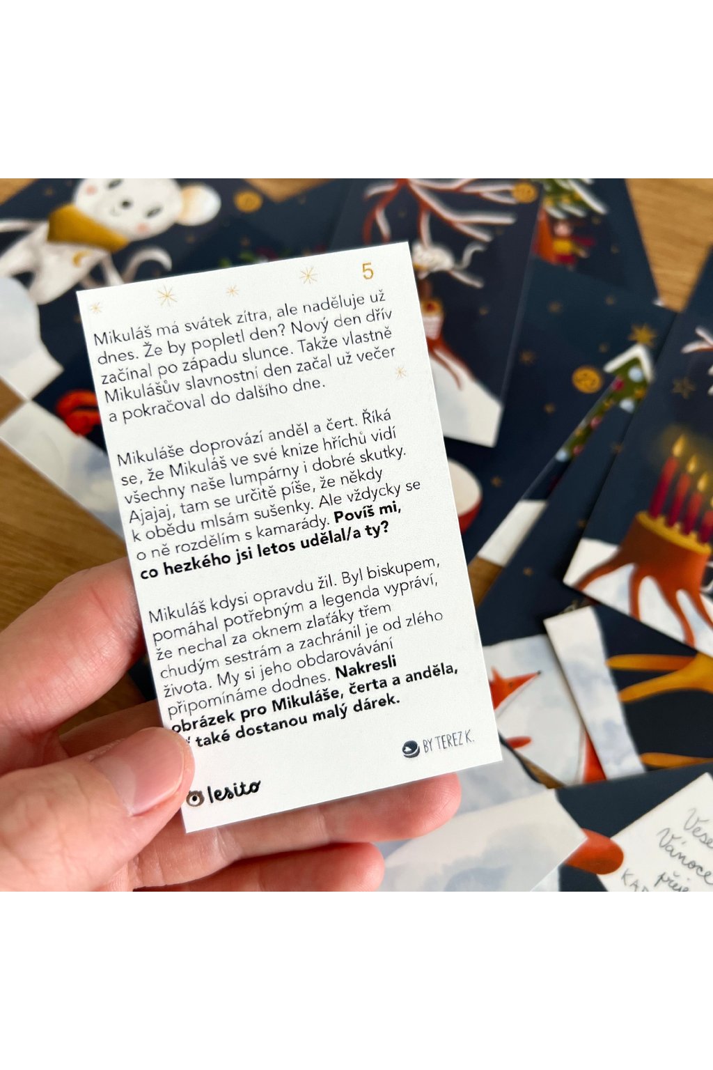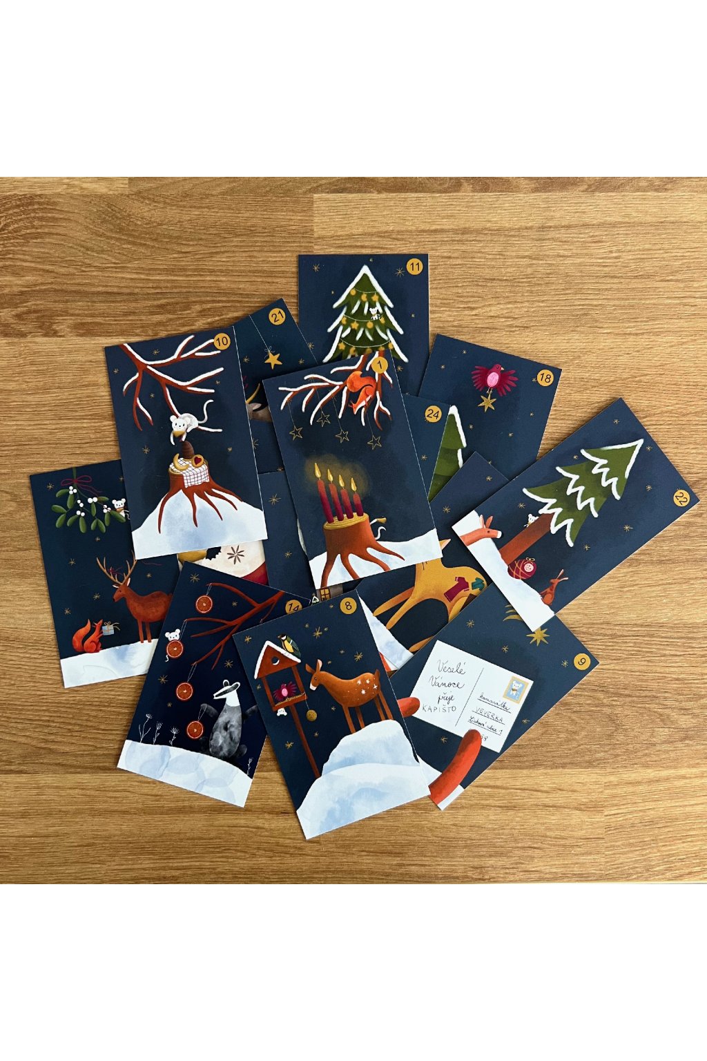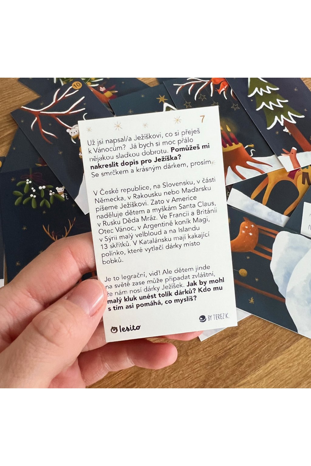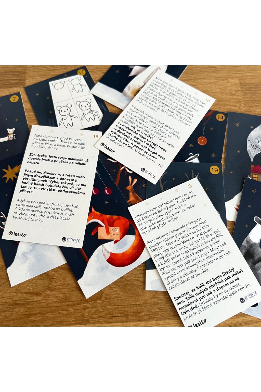Sada obsahuje 25 kartiček s adventní a vánoční tematikou. Autorkou nápadu a textů je Bára Pallová, která tvoří pod značkou Lesito a autorkou ilustrací jsem já.