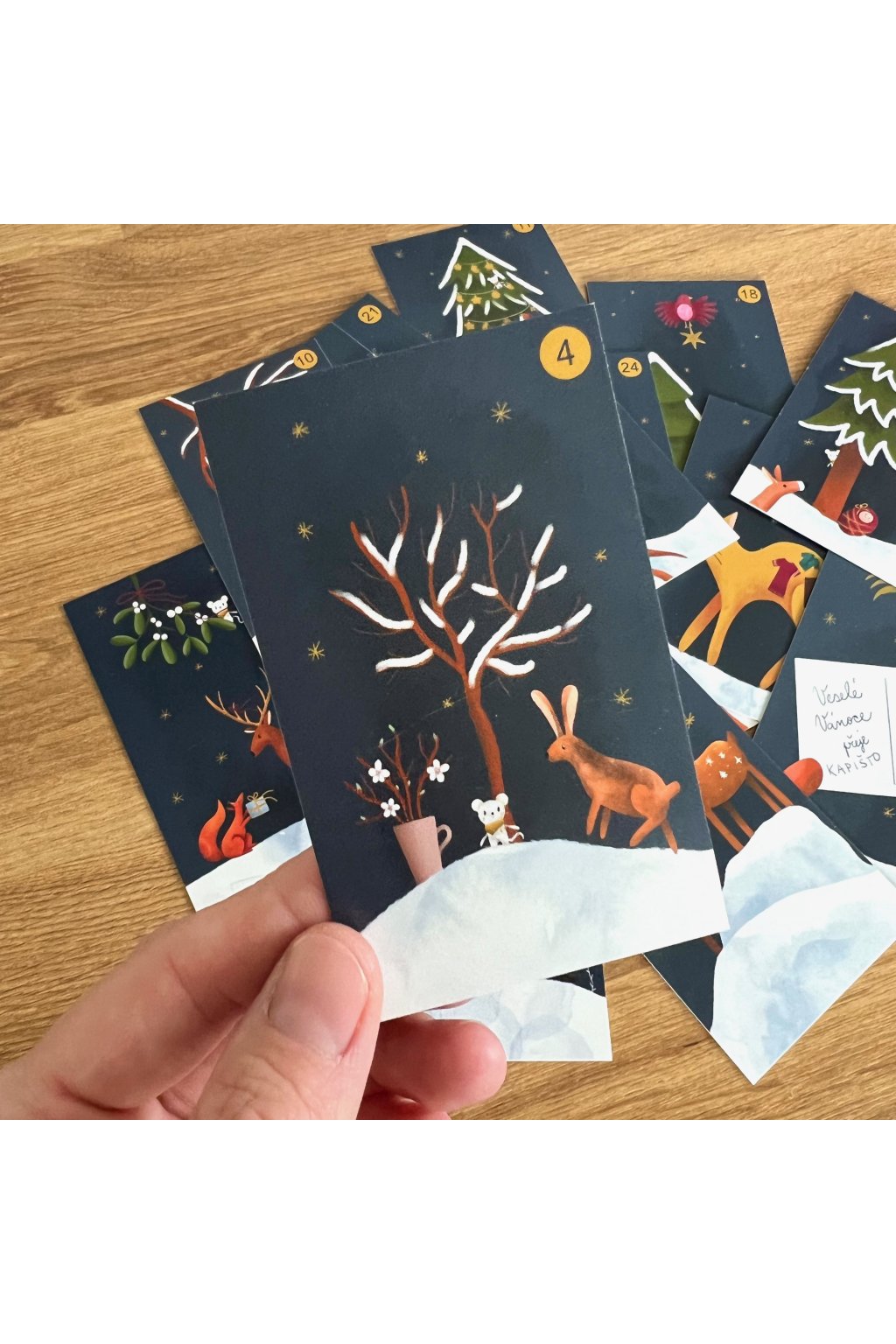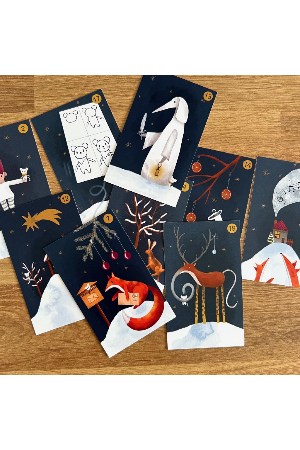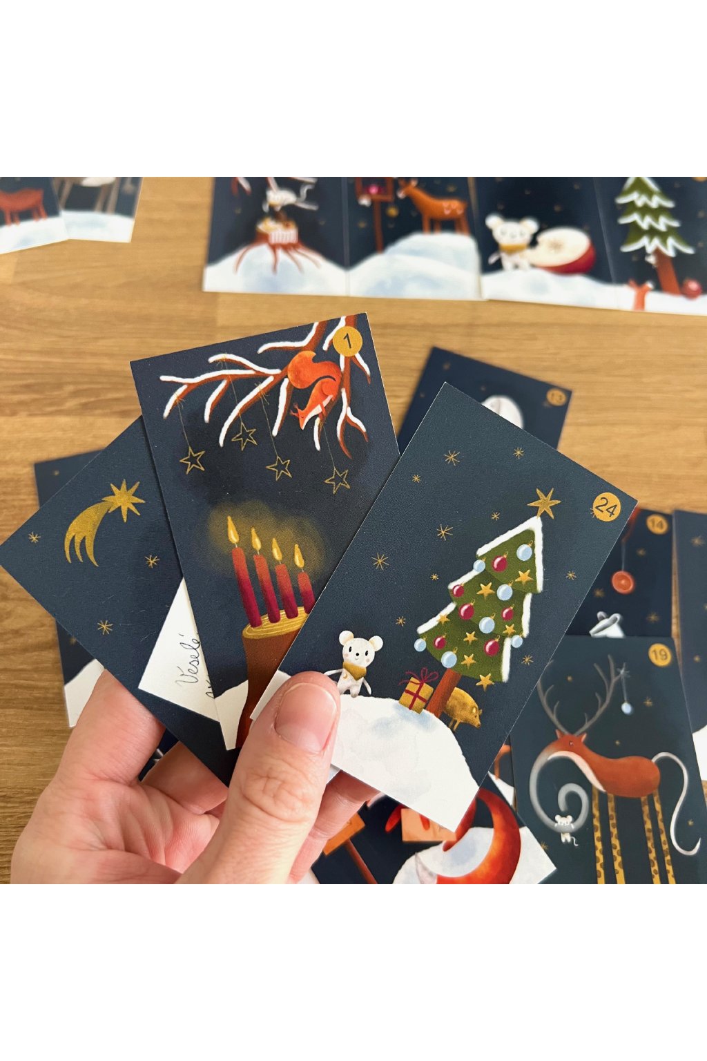 Sada obsahuje 25 kartiček s adventní a vánoční tematikou. Autorkou nápadu a textů je Bára Pallová, která tvoří pod značkou Lesito a autorkou ilustrací jsem já.